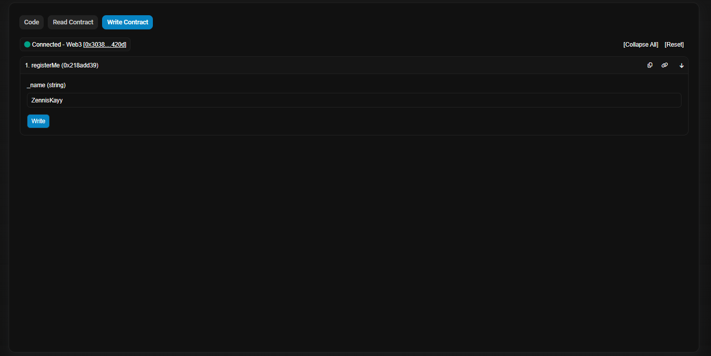Mục tiêu: Gọi thành công hàm registerMe với một tên bất kỳ để nhận được NFT “flag”.