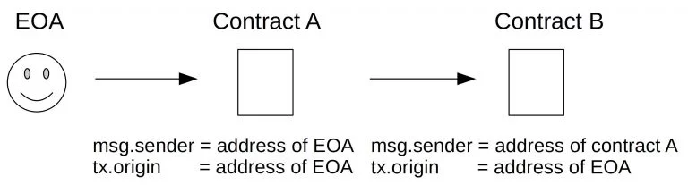msg.sender(Người gửi trực tiếp): Là địa chỉ đã gọi hàm hiện tại. Nó có thể là một ví người dùng (EOA - Externally Owned Account) hoặc một smart contract khác.tx.origin(Người khởi tạo giao dịch): Là địa chỉ ví người dùng (EOA) đã khởi tạo toàn bộ chuỗi giao dịch.tx.originluôn luôn là một EOA, không bao giờ có thể là một contract.